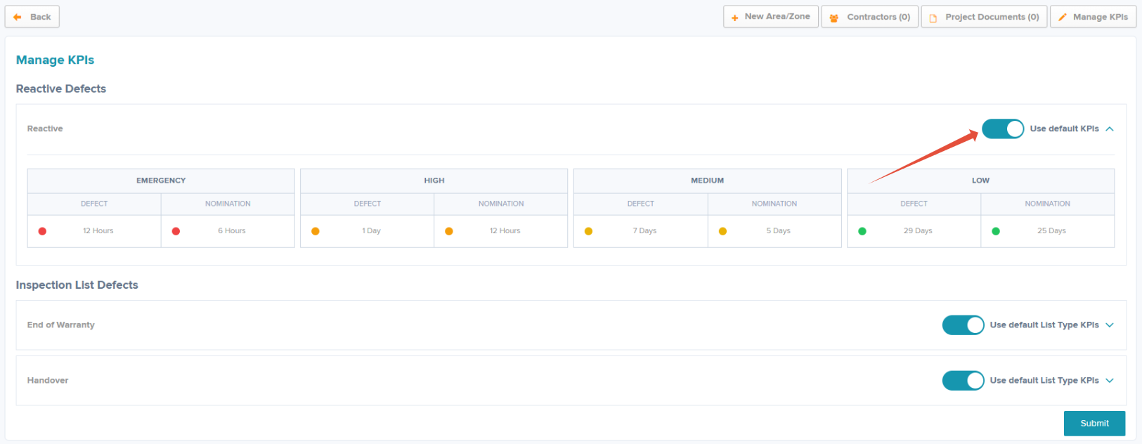 These will automatically be set as your Default KPIs but can be amended by un-toggling the 'Use Default KPIs' and selecting edit. You can also set these as Client KPIs by selecting submit and then clicking 'Apply Client KPIs'.
