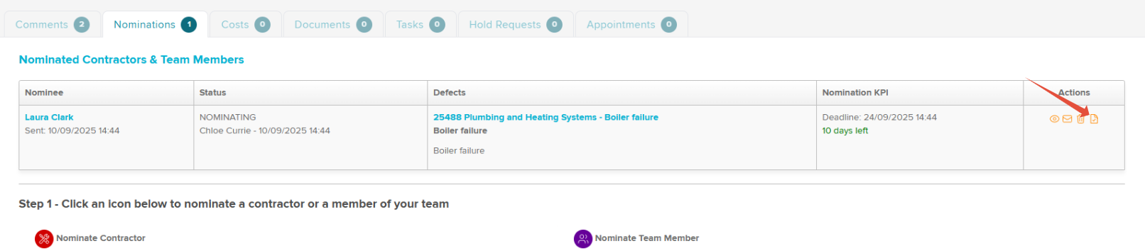 Step 1: Navigate to the 'Nominations' tab within the Defect and click the tick icon.