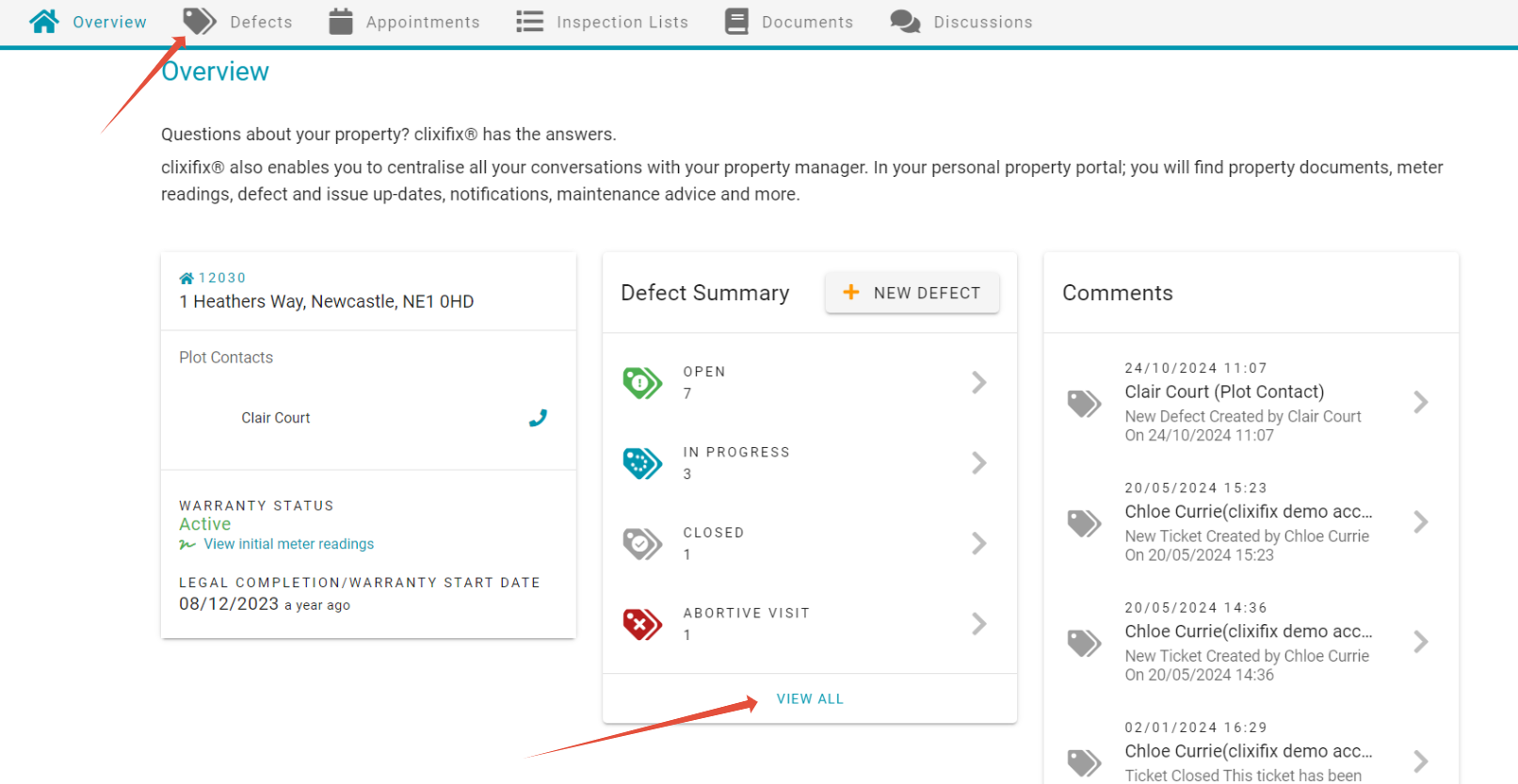 To view all Defects select Defects on the top toolbar or select VIEW ALL within the Defect Summary.