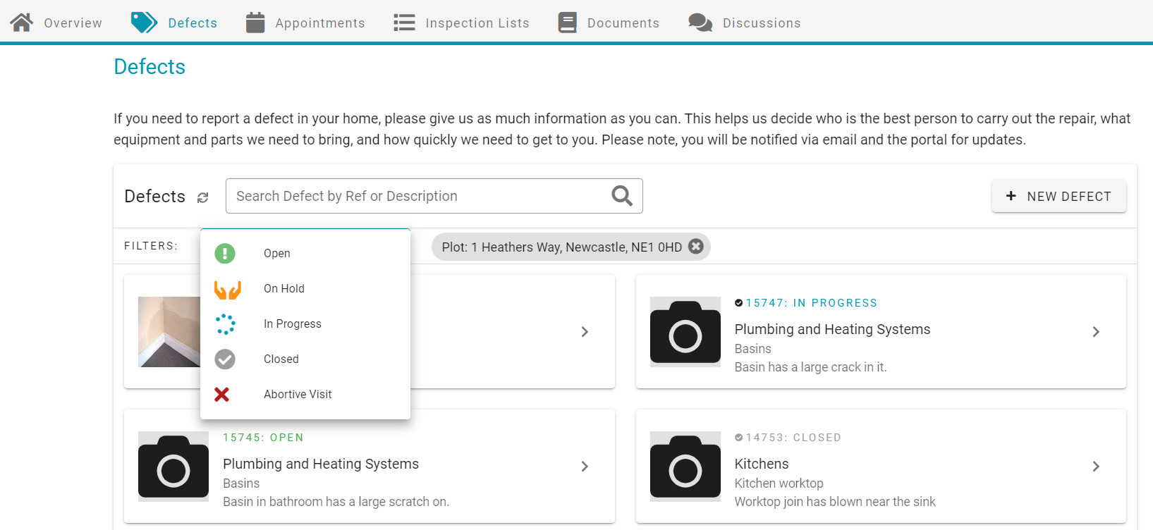 All of your Defects reported for your plot will be visible within your Resident Portal.
