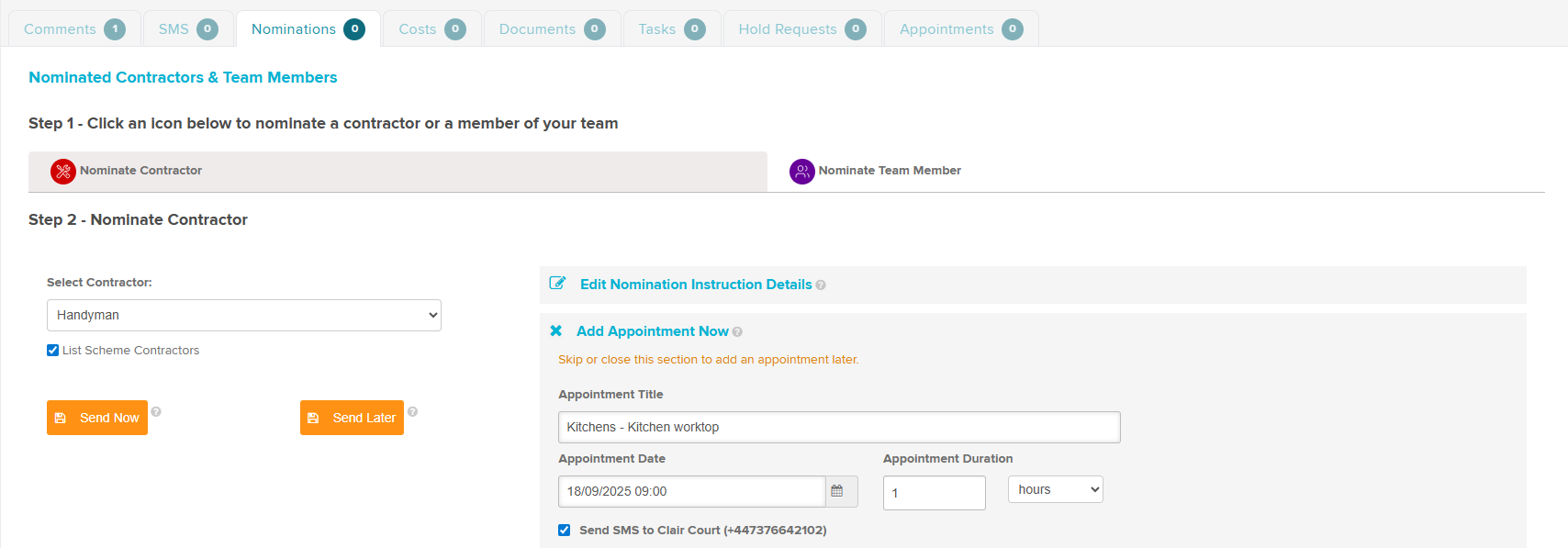 Step 2: Once your Defect is raised it will default to the Nominations tab, here you can add your appointment alongside your nomination, alternatively you can add your appointment later via the Appointment tab.