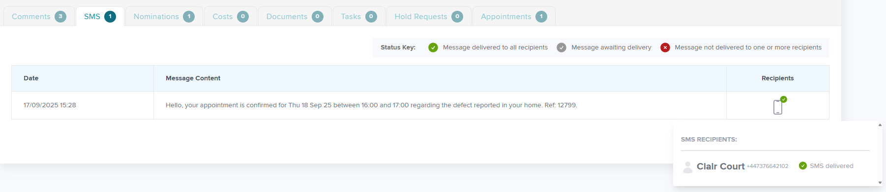 Every SMS will be recorded within the Defect comments and within the SMS tab which will show date & time, message content and the recipients. You can use the Status Key to see if the message has sent and get more information on the recipient by clicking the phone icon.
