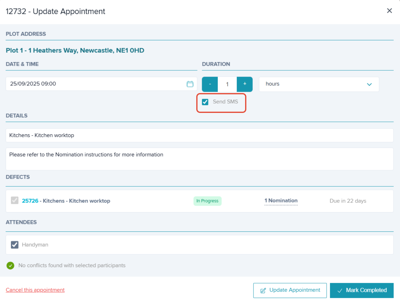 It will automatically select for SMS to be sent to the Defect contact, you can untick this if you do not wish to send the SMS.