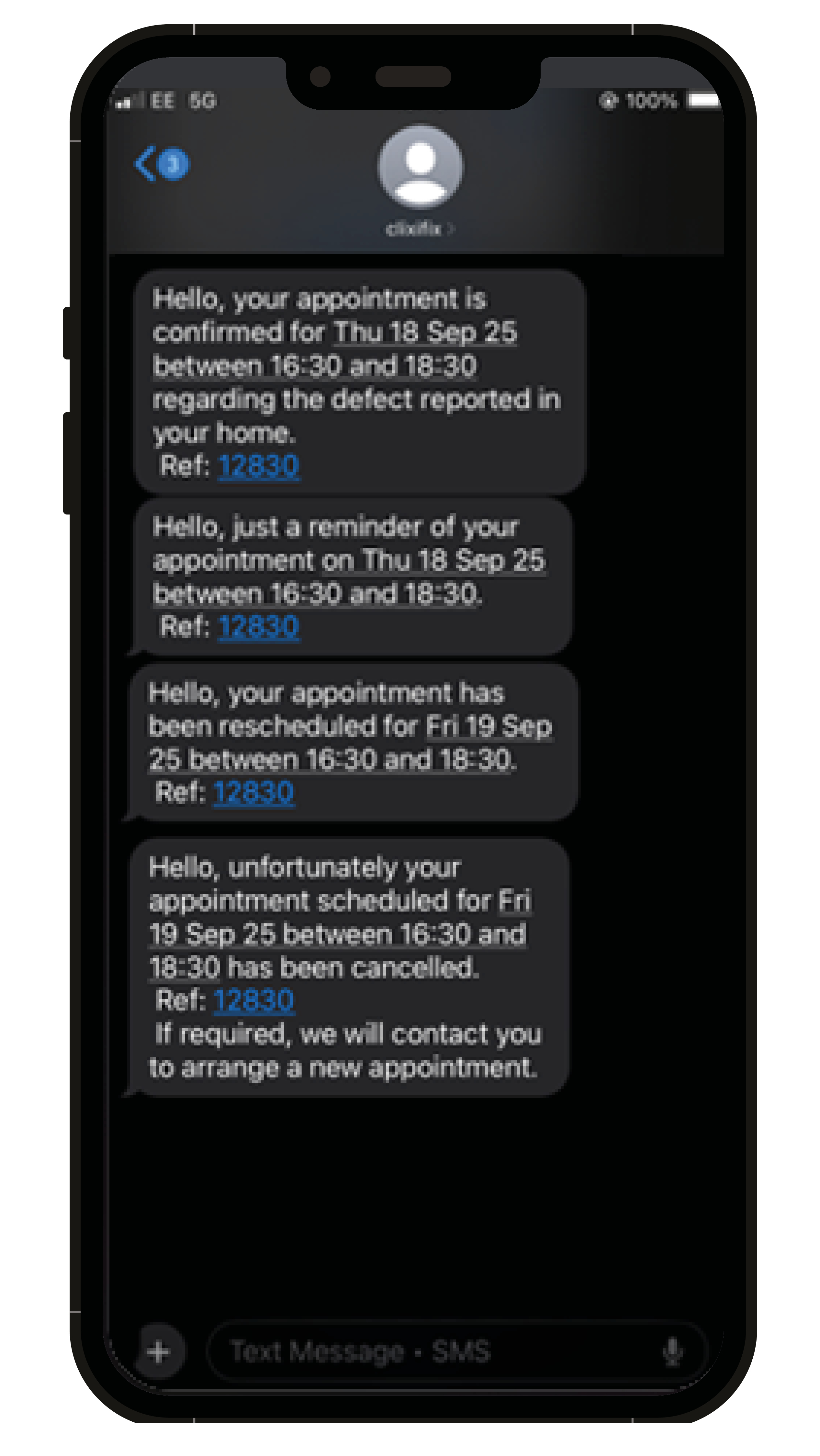 The clixifix® Appointment SMS feature gives you the option to send a text message when an appointment is booked. The recipient will also receive a reminder text 24 hours before the appointment and a notification text of any rescheduling or cancellation.